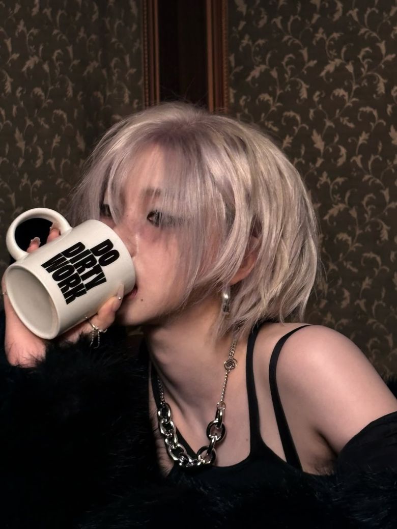카리나는 날개 이모지를 담은 짧은 멘트와 함께 여러 장의 사진을 공개했다. 공개된 사진 속 카리나는 백금발에 가까운 짧은 헤어스타일과 강렬한 메이크업으로 강한 인상을 남겼다. 'DO DIRTY WORK' 문구가 적힌 머그컵을 든 채 카메라를 응시하는 카리나의 모습은 마치 영화 속 한 장면을 연상케 한다.