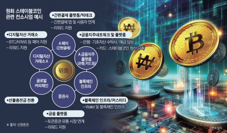 임민호 신영증권 연구원은 "플랫폼 기업들이 스테이블코인을 주도할 경우 통화정책ㆍ외환통제 기반이 약화할 수 있으며, 반대로 은행 단독 발행은 혁신 유인 부족이라는 한계를 가진다"라며 "은행 중심의 ‘컨소시엄 모델’이 대안이 될 수 있는데, 이 모델은 금융기관의 신뢰성과 민간의 확장성을 결합하며 수익 배분 구조를 통해 네트워크 효과와 사업 연계를 동시에 실현할 수 있다"라고 설명했다.