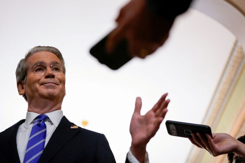 스콧 베선트 미국 재무장관이 28일 워싱턴 의사당에서 글로벌 최저세에서 미국 기업은 면제한다는 주요7개국(G7)과의 합의를 발표하고 있다. 로이터 연합뉴스 |
