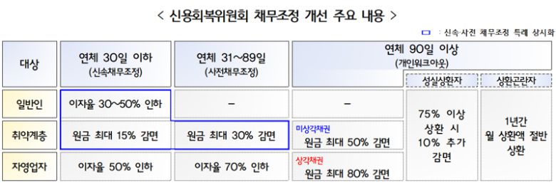 현재 운영 중인 신속채무조정 특례제도는 △지원 대상을 확대(신용평점 하위 10% → 20%)하고 △일반 채무자에 대한 약정금리 인하(無 → 30~50% 인하) 및 취약계층에 대한 원금 감면(無 → 최대 15%)을 지원한다. 사전채무조정 특례제도는 기초생활수급자와 장애의 정도가 심한 장애인, 70세 이상 고령자 등 취약계층에 대해 최대 30%까지 원금을 감면한다.