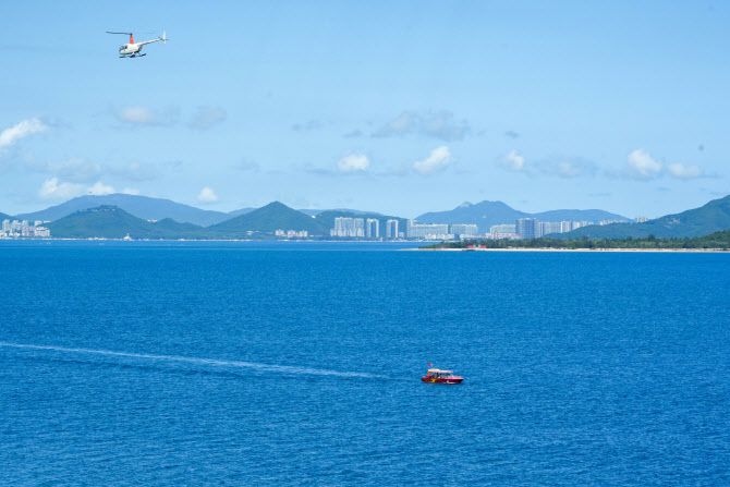 중국 하이난성 싼야 관광지에서 요트와 헬기가 지나가고 있다. (사진=징즈) |