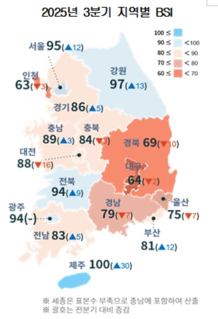 반면 인천(63)은 건설경기 침체에 따른 기계장비 업종 부진과 자동차·부품 관세 영향으로 부정적 전망이 강했고, 대구(64)·경북(69) 지역의 경우 철강업계 부진과 섬유산업 침체로 지수가 60대에 머물렀다.