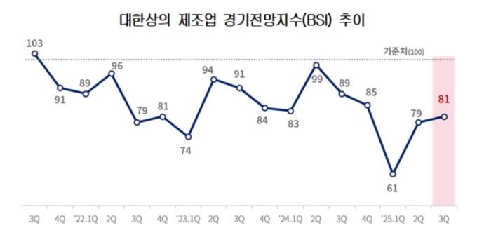 [서울=뉴스핌] 김승현 기자 = 반도체 등 수출 회복세와 새정부 경제정책 기대감에 2025년 3분기 기업경기전망지수(BSI)가 소폭 상승했지만, 미국 관세압박, 중동불안, 내수부진의 삼중고에 체감경기 상승폭은 제한된 것으로 나타났다.