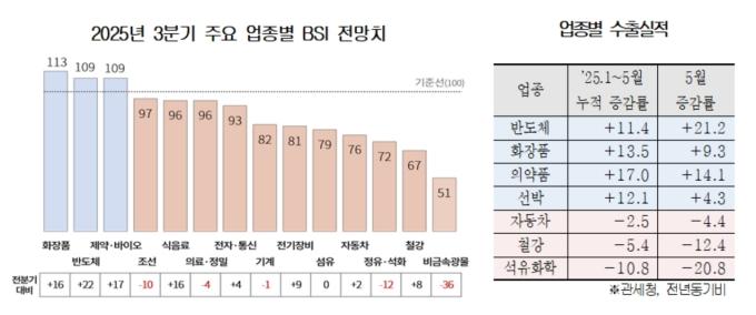 이는 AI산업 확산에 따른 고부가가치 반도체 수요 확대 등으로 수출이 증가하면서 체감경기 전망이 개선된 것으로 보인다. 화장품(113) 업종의 경우에는 관세영향에도 유럽, 중동 등으로 수출시장 다변화전략을 이어가며 가장 높은 전망치를 기록했다.