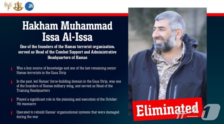 이스라엘군은 "알이사는 2023년 10월 7일 학살의 계획과 실행에서 중요한 역할을 했다"며 "가자지구 내 마지막 남은 하마스 고위 테러리스트 중 한 명이었다"고 설명했다.