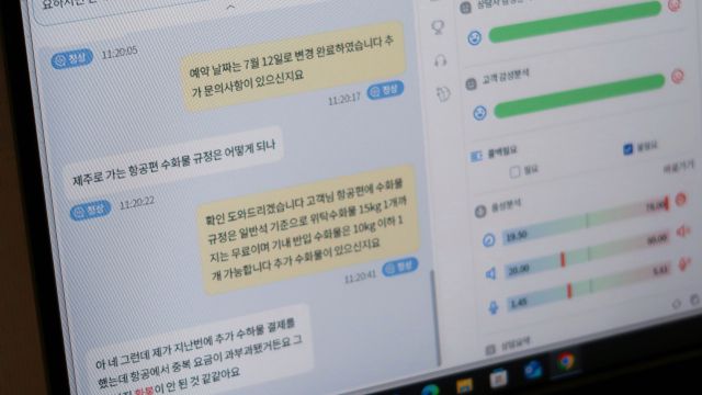 고객과 상담사가 연결되면 본격적인 ‘콜 상담’이 진행된다. 시연에선 가상 고객의 콜이 인입됐고, 고객 음성이 실시간 텍스트로 전환되도록 화면엔 채팅창이 띄워졌다. 고객이 “항공권 날짜를 7월10일에서 12일로 바꾸고 싶다”고 말하니 AI는 해당 발화를 텍스트로 변환했고, 해당 고객 질문을 클릭하니 화면 오른쪽에 자동으로 해당 질문에 대한 적절한 답변 예시가 나타났다. 상담사는 고객 기본 정보 확인 후, 변경 절차와 운임료에 대해 안내할 수 있었다.