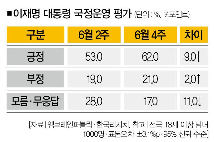 이런 국정 변화가 통했는지 6월 넷째주 이재명 대통령의 국정 수행에 대한 긍정 평가가 62.0%로 2주 전보다 9%포인트 상승했다는 여론조사 결과가 나왔다(전국 지표조사·그래픽 참조). 한편에선 과거와 비슷한 구태도 발견된다. 친구에게 부동산을 맡겼다가 소송을 걸어 돌려받았다는 대통령실 민정수석이 낙마했다. 내각의 남은 부처에는 적재적소 인사가 중요하다.