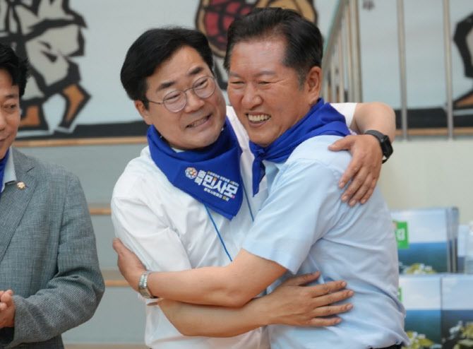 더불어민주당 당대표 선거 후보인 박찬대·정청래 의원이 28일 오후 충북 청주시 내수생활체육공원 실내체육관에서 열린 충북 민사모(민주당을 사랑하는 모임) 민주 대동제에 참석해 포옹을 하고 있다. (사진=뉴시스) |