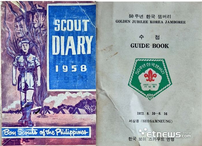 스카우트 수첩: 왼쪽은 극동아 스카우트 창설 회의(1958)가 열린 필리핀 발행, 오른쪽은 50주년 한국 잼버리용(1972) |