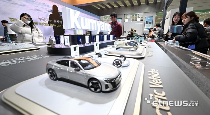 지난 3월에 열린 배터리 전시회 '인터배터리 2025'에서 참관객이 금양의 배터리 사업군을 살펴보고 있다.  이동근기자 foto@etnews.com