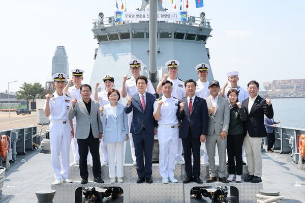포항시는 28일 포항함에서 해군 1함대사령부 포항함(FFG)과 자매결연 협약을 체결했다. 이날 주요 참석인들이 기념촬영을 하고 있다. (사진 = 포항시 |