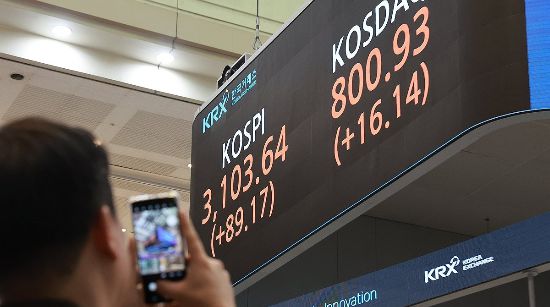 24일 서울 여의도 한국거래소 현황판에 코스피와 코스닥지수 종가가 표시돼 있다. (사진=연합뉴스) |