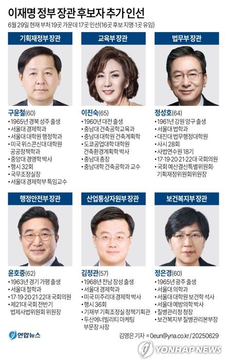 (서울=연합뉴스) 임형섭 고동욱 황윤기 기자 = 이재명 대통령은 29일 기획재정부 장관 후보자로 구윤철 서울대 경제학부 특임교수를 지명하는 등 6개 부처 장관 후보자를 추가로 인선했다.