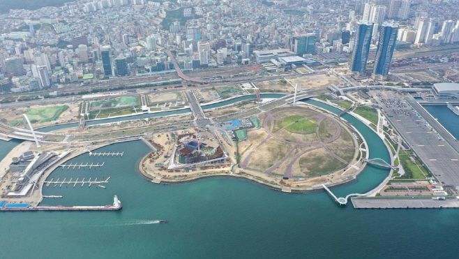 생활숙박시설 건립공사가 한창인 북항재개발 현장 전경. /부산항만공사 |