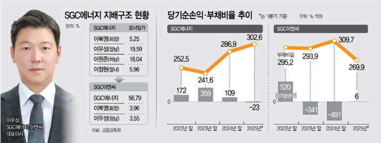 재무 건전성 역시 우려 요인이다. 지난해 말 기준 SGC이앤씨의 부채비율은 309.7%로 2020년(382%) 이후 다시 300%대를 돌파했다. 올해 1분기에도 269.87%였다. 통상 부채비율이 200%를 넘어가면 재무 구조가 불안한 기업으로 본다.