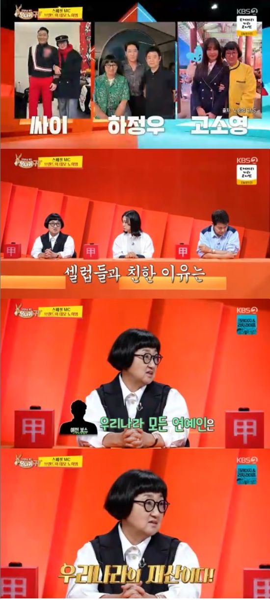 노희영은 "제가 셀럽과 치난 이유는 제 옛날 보스가 '모든 연예인은 우리나라 재산이다'라고 한 게 머리에 박혀서 그렇다"면서 인맥 관리는 자산 관리의 일부라고 했다.