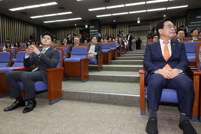 김용태(왼쪽) 국민의힘 비상대책위원장과 송언석 원내대표가 27일 서울 여의도 국회에서 열린 의원총회에 참석해 있다. 연합뉴스 |