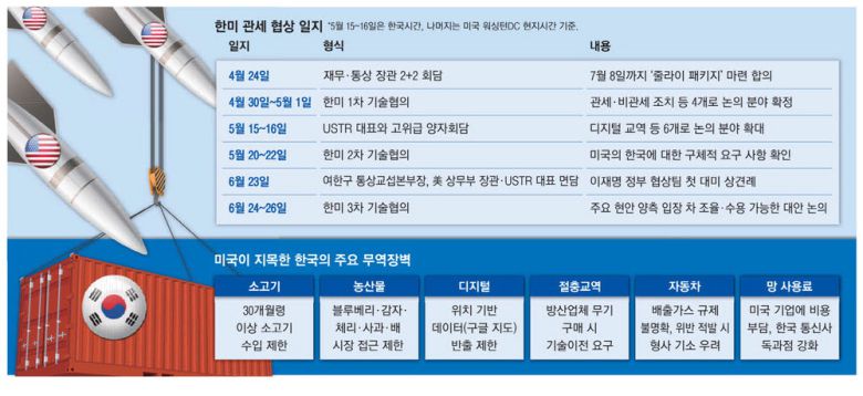 이번 관세 협상에 참가한 정부 관계자는 자동차·철강과 관련한 한국 정부의 명확한 입장을 미국 측에 전달했다고 강조했다. 이 관계자는 "이들 산업은 한국의 주력 산업이고 우리 기업들이 미국에 투자를 많이 하고 있다"며 "(품목 관세를) 최대한 없애는 것이 한국 정부에는 매우 중요하다고 여러번 강조했다"고 설명했다. 또 알래스카 액화천연가스(LNG) 사업과 관련해서는 " 미국 대통령이 직접 특정 프로젝트를 거론하며 우선순위를 두고 있는 것은 알래스카 하나"라며 "계속 협의를 강화하면서 선의의 협력을 이어가도록 노력하려 한다"고 강조했다.