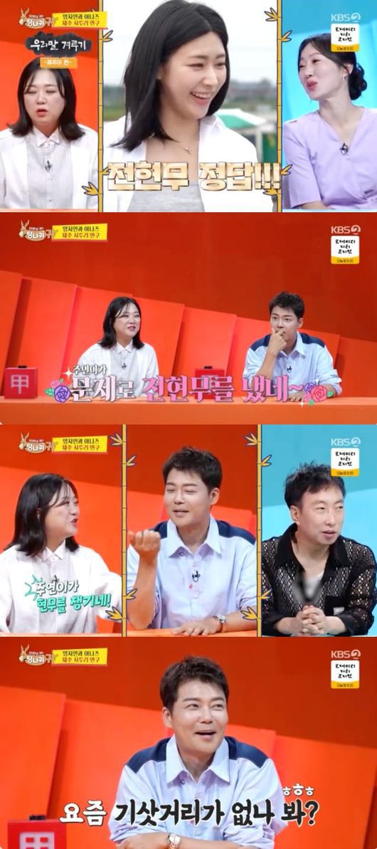 첫 문제의 답으로 전현무자 나오자 스튜디오에서는 난리가 났다. 김숙은 “주연이가 문제로 전현무를 났네”라면서 의미심장한 미소를 지었고, 박명수는 “남편 챙기는 거 봐”라고 거들었다. 김숙도 “챙긴다. 현무야 주연이가 너를 챙긴다”라면서 전현무와 홍주연을 연결지었다. 이에 전현무는 포기한 듯 “기사가 요즘 많이 없나 보다”라고 말해 웃음을 줬다.
