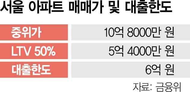 29일 금융계에 따르면 서울 아파트 중위 매매가격은 5월 기준 10억 8000만 원이다. 수도권 규제지역에 적용하는 주택담보인정비율(LTV) 50%를 적용하면 가능 대출액은 5억 4000만 원이 나온다. 대출 한도를 6억 원으로 제한해도 서울 내 중저가 아파트를 사는 데는 큰 무리가 없다는 게 당국의 논리다. 특히 올 1분기 기준으로 6억 원 이상 빚을 내는 이들은 전체 차주의 10% 수준에 불과해 부작용이 적다는 것이다.
