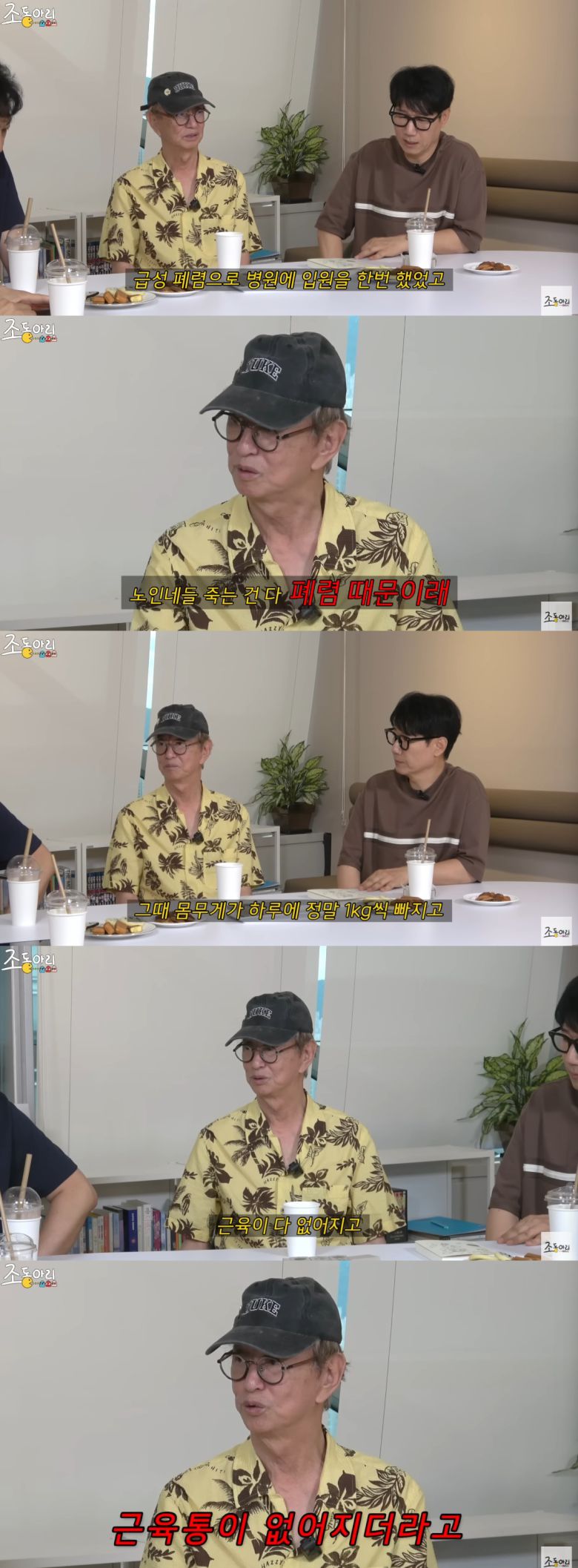 전유성은 부정맥으로 건강이 안 좋아지기도 했다며 "하루에 몸무게가 1kg씩 빠지고 근육이 없어지더라. 근육 없어지니 근육통은 없어져서 좋더라"라고 이야기했다.