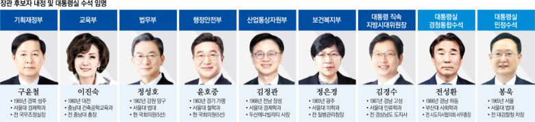이날 지명된 장관 후보자는 △구윤철 경제부총리 겸 기획재정부 장관 후보자 △이진숙 전 충남대학교 총장(교육부) △정성호 국회의원(법무부) △윤호중 국회의원(행정안전부) △김정관 두산에너빌리티 사장(산업통상자원부) △정은경 전 질병관리청장(보건복지부)이다.