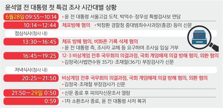 윤 전 대통령 측과 내란 특검은 2차 조사일을 놓고도 줄다리기를 이어가고 있다. 특검은 애초 30일에 출석하라고 통지했는데, 윤 전 대통령 측은 출석일자를 7월3일 이후로 조정해 달라고 요청했다. 박 특검보는 회의 끝에 하루 늦은 7월1일 오전 9시에 출석하라고 다시 통지했다면서 “(소환 일정) 결정은 수사 주체가 하는 것”이라고 강조했다.