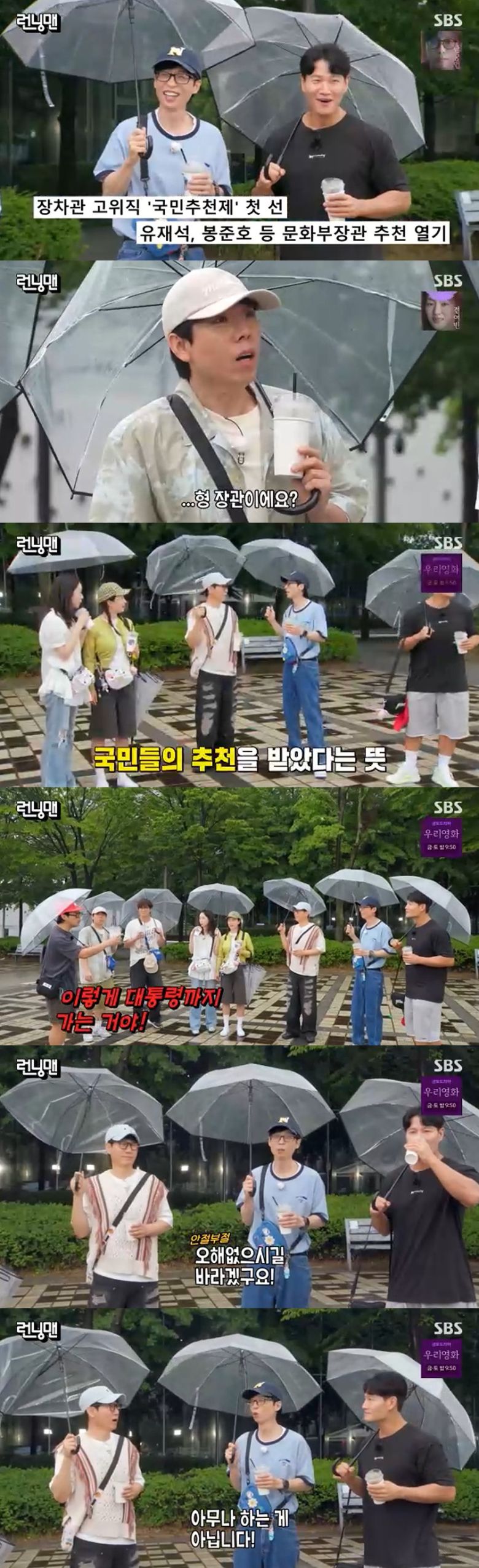 김종국은 "잘하면 장관님 나오시겠다"며 이를 축하했고, 송지효는 "오빠 잘 부탁드린다"며 김칫국을 마셔 웃음을 자아낸다.