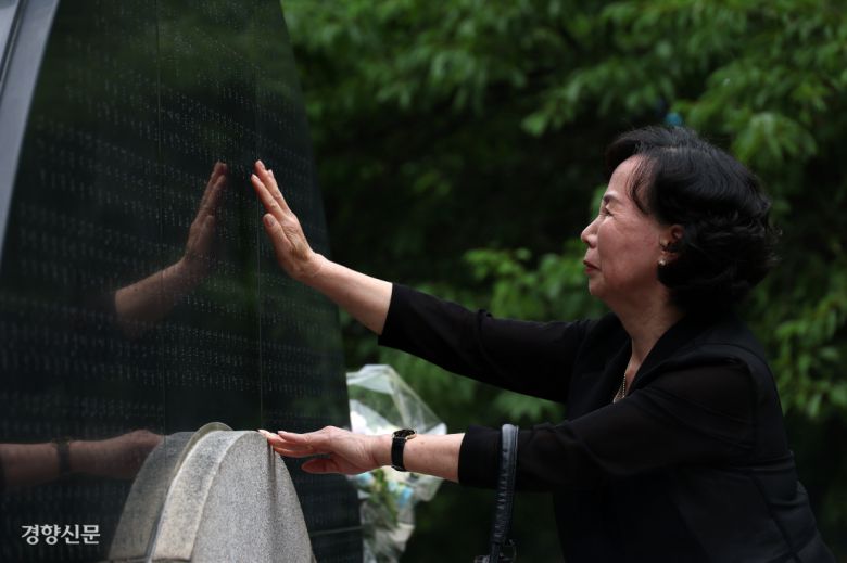끝없는 그리움 삼풍백화점 붕괴 참사 30주기인 29일 서울 서초구 매헌시민의숲 삼풍참사위령탑을 찾은 유족이 희생자 이름이 새겨진 위령탑을 만지고 있다. 권도현 기자 |