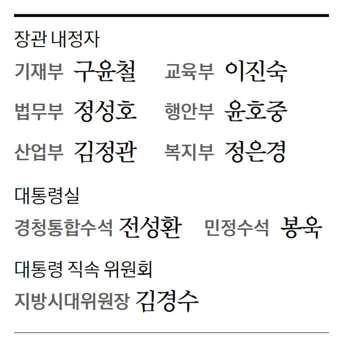 부총리 겸 교육부 장관에는 이진숙 전 충남대 총장이 내정됐다. 산업통상자원부 장관에는 김정관 현 두산에너빌리티 사장, 보건복지부 장관에는 정은경 전 질병관리청장을 각각 내정했다. 장관급 인사인 대통령 직속 지방시대위원장에는 김경수 전 경남지사를 위촉했다. 이날 6개 부처 장관이 내정되면서 국토교통부·문화체육관광부를 제외한 17개 부처의 인사가 마무리됐다.