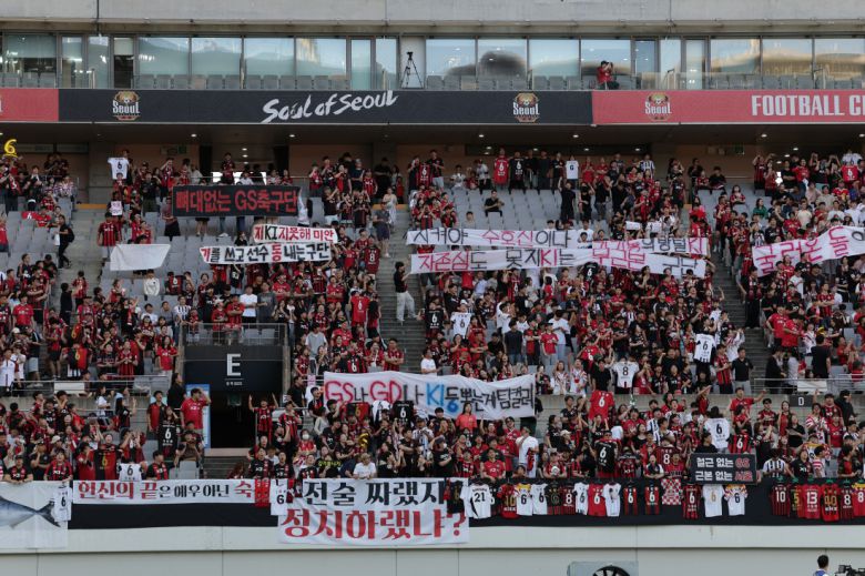 뿔난 팬들 “FC서울, 레전드를 버렸다” FC서울 서포터스가 29일 서울월드컵경기장에서 FC서울-포항 스틸러스전에 앞서 기성용 이적에 대해 서울 구단과 김기동 감독을 비난하는 다양한 플래카드를 내걸고 있다. 한국프로축구연맹 제공