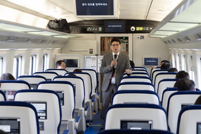 김종훈 현대로템 레일솔루션 본부장이 24일 2세대 KTX-이음 시승회가 열린 객실 내에서 열차에 대해 설명하고 있다. |