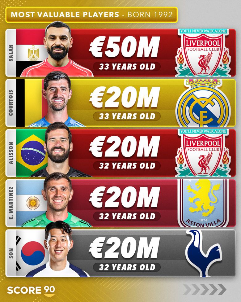 축구 컨텐츠 제작소 스코어90은 29일(한국시간) 1993년부터 1967년에 태어난 현역 축구선수들의 시장 가치를 평가해 생년별 몸값 TOP 5를 공개했다.