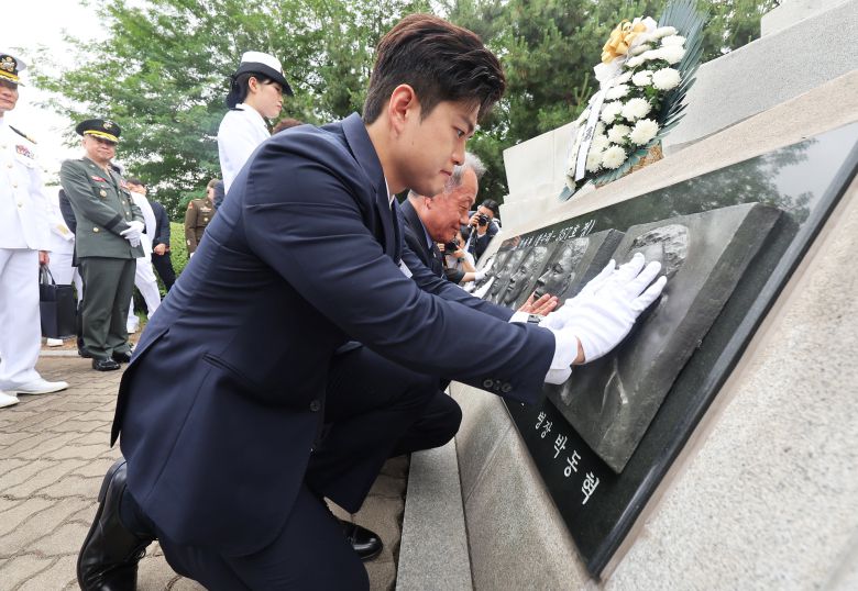 제2연평해전 승전 23주년 기념식 찾아 - 김용태 국민의힘 비상대책위원장이 29일 경기 평택시 해군 제2함대사령부에서 열린 제2연평해전 승전 23주년 기념식에서 전사자들의 얼굴 부조를 어루만지고 있다. /뉴시스 |