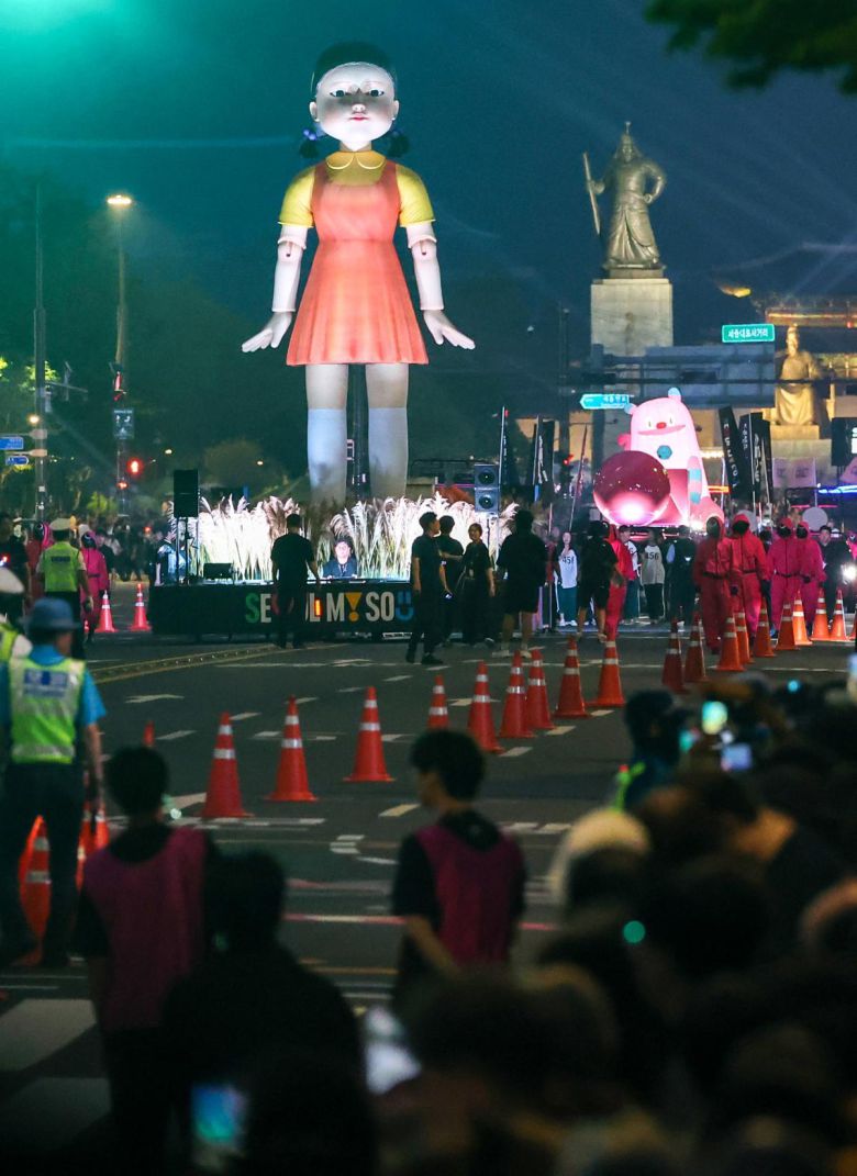 28일 서울 종로구 광화문광장과 중구 서울광장 일대에서 벌어진 ‘오징어 게임’ 피날레 행사에 등장한 초대형 살인 기계 ‘영희’. 뉴스1 |
