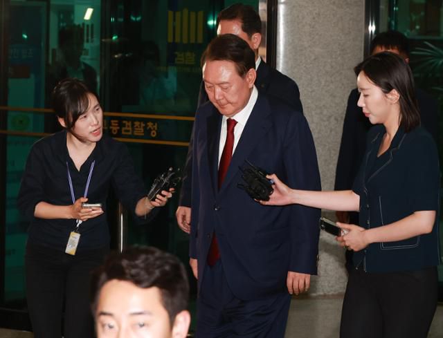 윤석열 전 대통령이 28일 특검 조사를 마친 뒤 서울 서초구 서울고검 청사를 나서고 있다. 연합뉴스 |