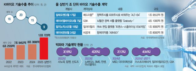올해 상반기 국내 제약·바이오 업계의 기술수출 규모가 12조 원을 넘어서며 역대 최고치를 경신했다. 글로벌 대형 제약사와의 초대형 계약이 이어지면서 반년 만에 지난해 연간 실적을 뛰어넘었다. 업계에서는 신약 개발의 효율성과 후보물질 발굴에 활용할 수 있는 플랫폼 기반 기술을 중심으로 국내 기술의 양적·질적 도약이 이뤄졌다는 평가가 나온다.
