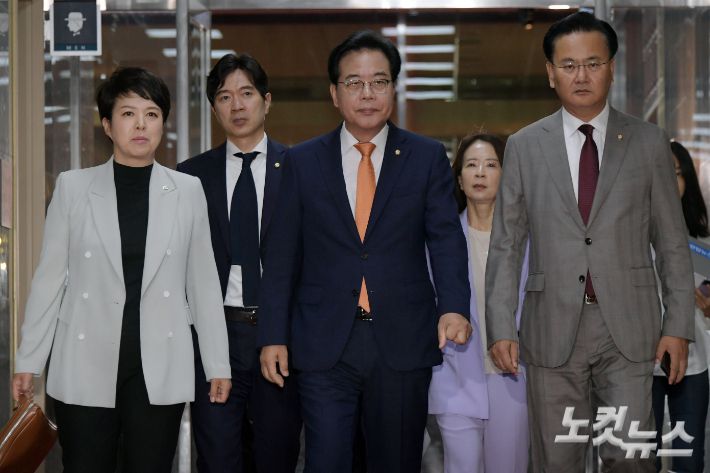 국민의힘 송언석 원내대표와 유상범 원내수석부대표가 27일 오전 서울 여의도 국회에서 우원식 국회의장과 면담을 위해 의장실로 향하고 있다. 윤창원 기자 |