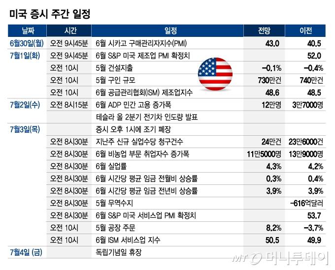 이번주 거래는 7월4일이 독립기념일로 휴장하고 하루 전날인 7월3일은 증시가 오후 1시에 조기 폐장하기 때문에 사실상 거래일수가 3.5일로 단축된다. 거래일수는 짧아지지만 주목해야 할 일정이 많아 이번주는 밀도 있는 한 주간이 될 것으로 예상된다.