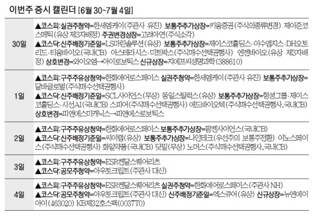 아울러 아우토크립트는 7월 3일 공모주 청약을 진행한다. 자동차 보안 전문기업인 아우토크립트는 차량 생산에서 소비까지 전 단계별로 최적화된 자동차 보안 시스템을 제공한다. 이밖에도 30일 키움증권과 제이준코스메틱·제이스코홀딩스·이수앱지수·DH오토리드·티움바이오·아스테라시스·엔젠바이오 등을 시작으로 팜젠사이언스·나인테크·화일약품(7월 2일) 등이 보통주 추가 상장 절차를 진행한다.
