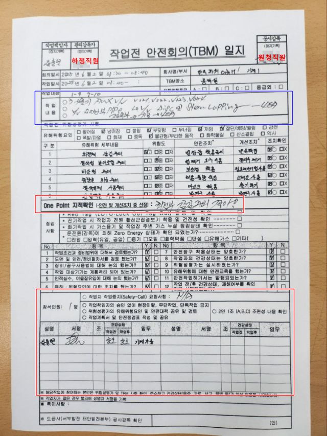 ▲사망 당일 김 씨의 오전 작업 TBM 일지. 원청 직원은 공사감독으로서 오른쪽 상단에 서명하고, 작업내용(파란색)도 기재한다. 이날 'One Poing 지적확인'엔 "회전부 감김주의"가 적혔다. 가장 아래 빨간 네모 안엔 '참석인원 1명'으로 김충현씨 서명만 적혀 있다. ⓒ대책위