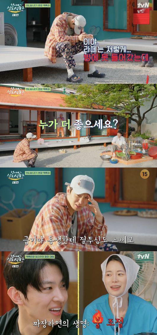 이에 질투가 폭발한 임지연은 “언니 왜 진영이만 칭찬하고”라며 서운함을 토로했고, 염정아는 “그랬어 내가? 그런건 아닌데”라고 해명했다. 그러자 덱스는 “정아 누나가 거짓말 못해서 그런거다”라고 했고, 임지연은 “너 가만히 있어. 말리지마”라고 받아쳤다. 결국 염정아는 “애들이 많으니까 힘들긴 하다”라고 한숨을 쉬어 웃음을 안겼다.