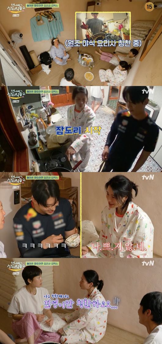 우여곡절 끝에 완성된 짜장라면. 이재욱은 “형 너무 맛있다”라며 만족해했다. 반면 임지연은 의심의 눈초리로 뜨더니 이내 “나쁘지 않네”라고 반응했다. 이에 덱스는 “평가하지 말고 맛있게 먹어라”라며 너스레를 떨었다. 티격태격하는 두 사람에 염정아는 “귀여울 나이도 아닌 것들이”라고 웃었다.