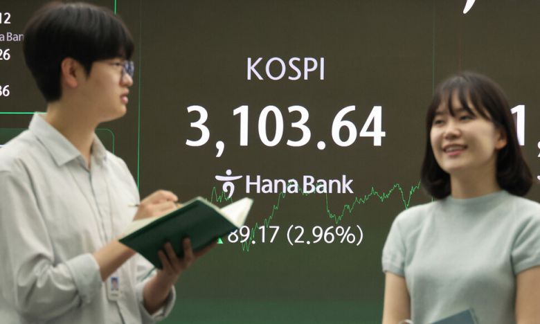코스피가 3% 가까이 급등해 3년 9개월 만에 3100선을 돌파했다. 24일 코스피는 전 거래일(3014.47)보다 89.17포인트(2.96%) 오른 3103.64에 장을 마쳤다. 코스닥 지수는 전 거래일(784.79)보다 16.14포인트(2.06%) 상승한 800.93에 거래를 종료했다. 사진은 이날 서울 중구 하나은행 딜링룸 전광판 모습. 김혜윤 기자 unique@hani.co.kr