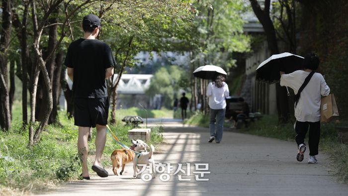 청계천 반려동물 출입 시범사업이 처음 시행된 지난해 9월 30일 서울 동대문구 황학교 근처에서 행인이 반려견과 산책하고 있다. 정효진 기자
