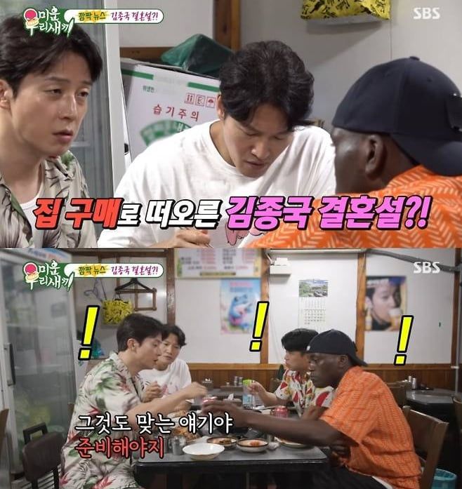 이에 김종국은 “그것도 맞는 이야기다. 준비해야지. 집이 없으면 어떡하냐”고 인정했다. 허경환이 “지금 (여자친구) 공개하는 거냐”고 묻자 김종국은 “그건 아니다. 준비를 해야 결혼을 하고”라고 답을 흐렸다. 허경환이 계속해서 “있냐. 축하드린다”고 하자 김종국은 “몰아가기 하지 마”라며 회피했다.