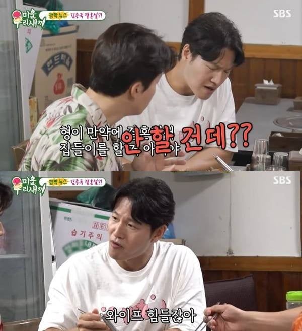 또 허경환은 “가상인데 형이 결혼을 했으면, 집들이를 할 거 아니냐”고 물었다. 이에 김종국은 “안 할 건데?”라고 했고, 허경환이 “좋은 집 놔두고 왜 집들이를 안 하냐”고 묻자 김종국은 “와이프가 힘들잖아”라고 답했다.