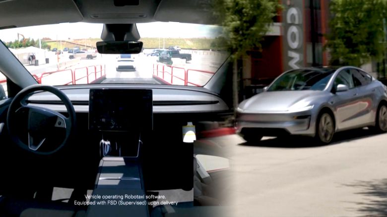 운전석에 아무도 타지 않은 은색 테슬라 차량이 스스로 운전하기 시작합니다.