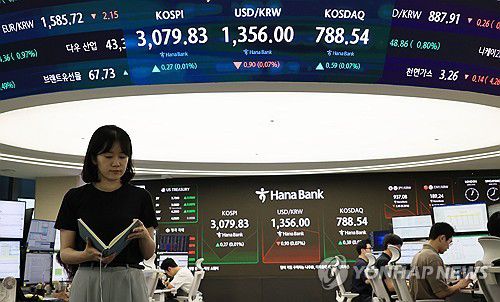 코스피지난 27일 서울 중구 하나은행 본점에서 직원들이 증시와 환율을 모니터하고 있다. [연합뉴스 자료사진]