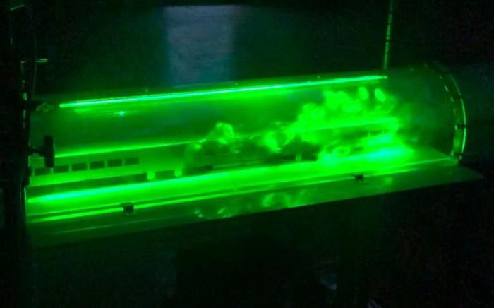 터널 축소모형에서 터널 화재 시 연기 흐름을 시험하고 있다.